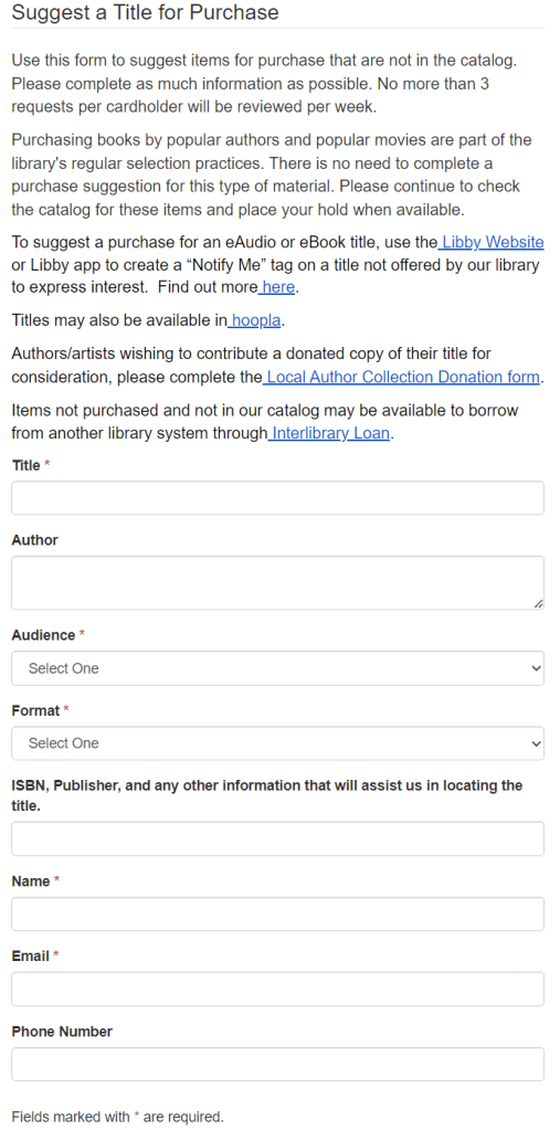 #3 – Go to your library’s website and search for something like, “Suggest a Purchase.” This is what my library’s page to fill out looks like: