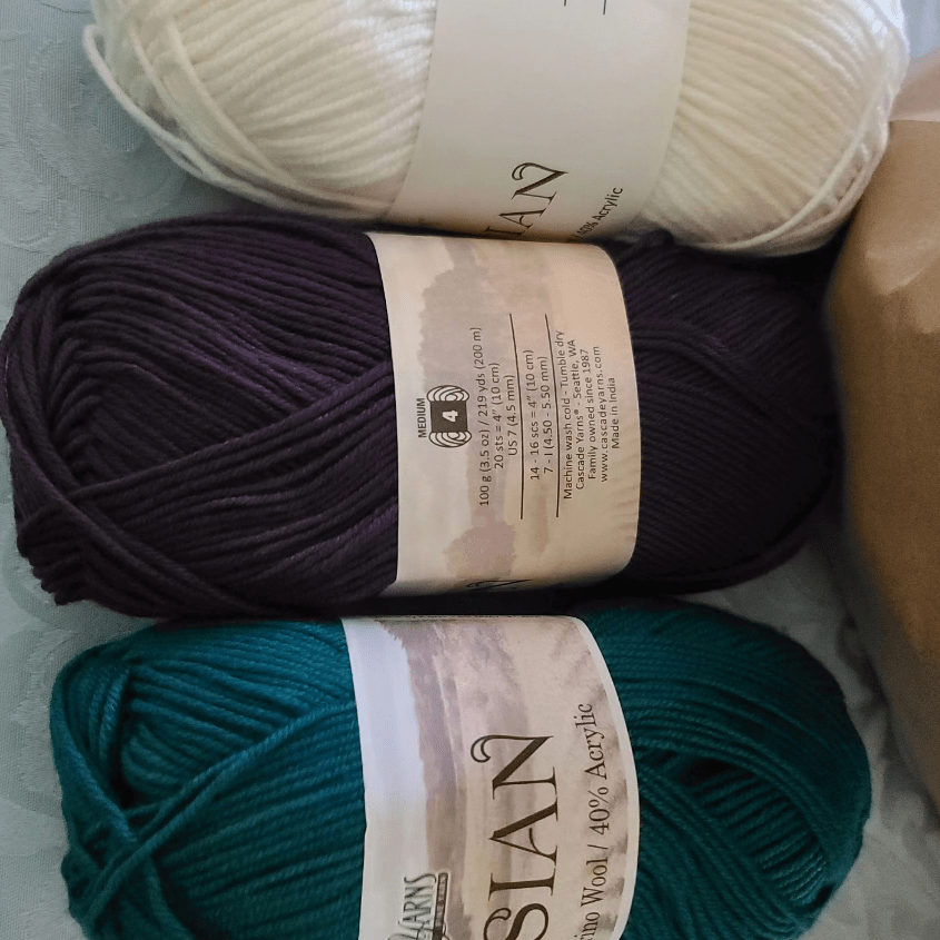 She took some measurements, and we worked out a time to get the yarn. I went to the shop she works at when her shift was ending, and I picked out the colors in the picture above.